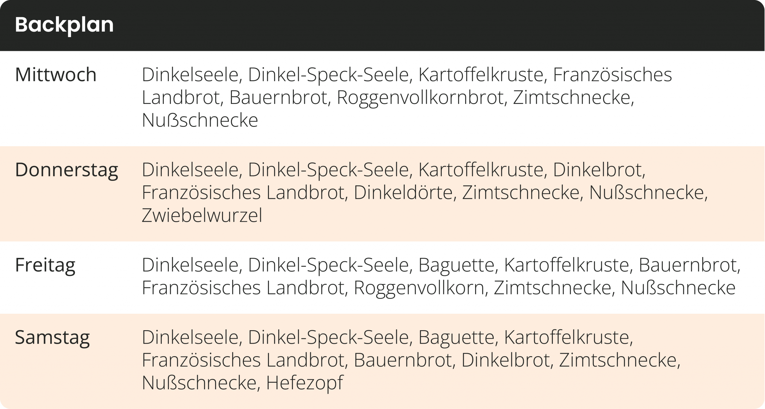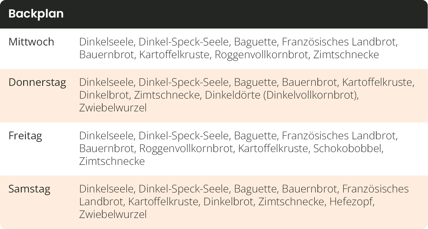 Individuelle Bestellungen, welche nicht auf dem Backplan stehen, müssen im Vorfeld abgeklärt werden!